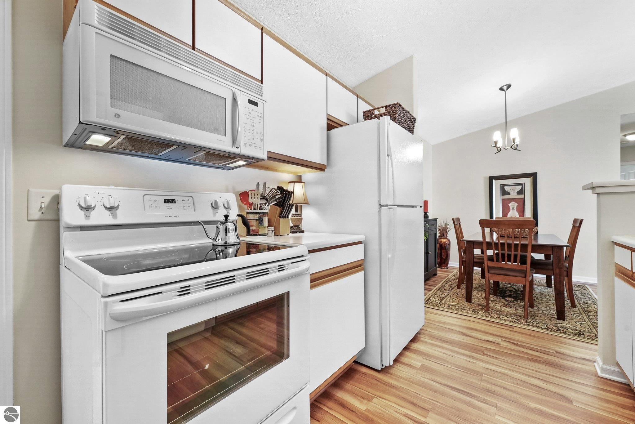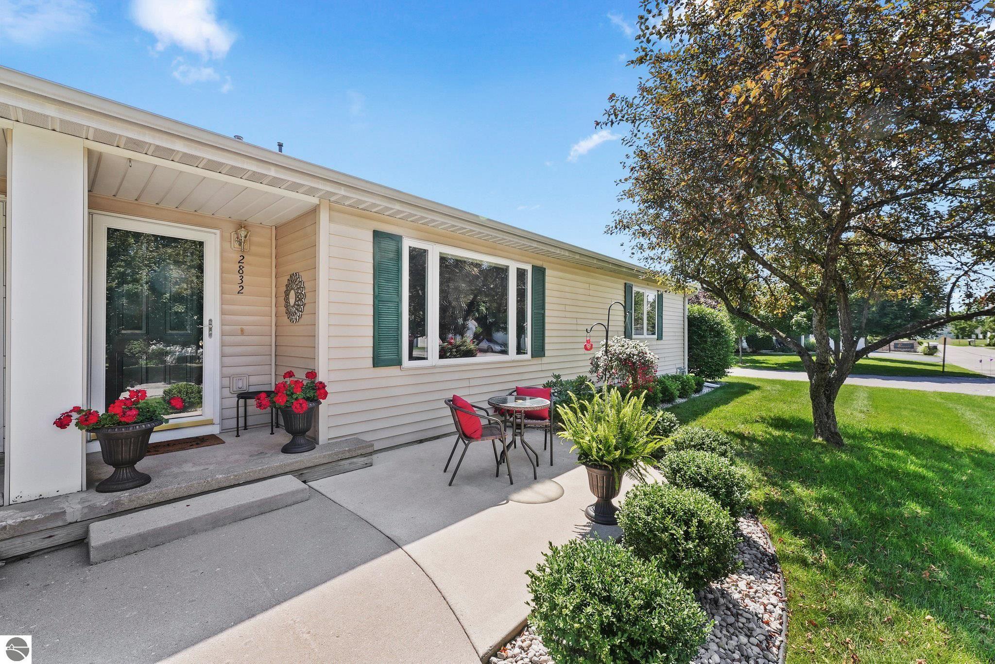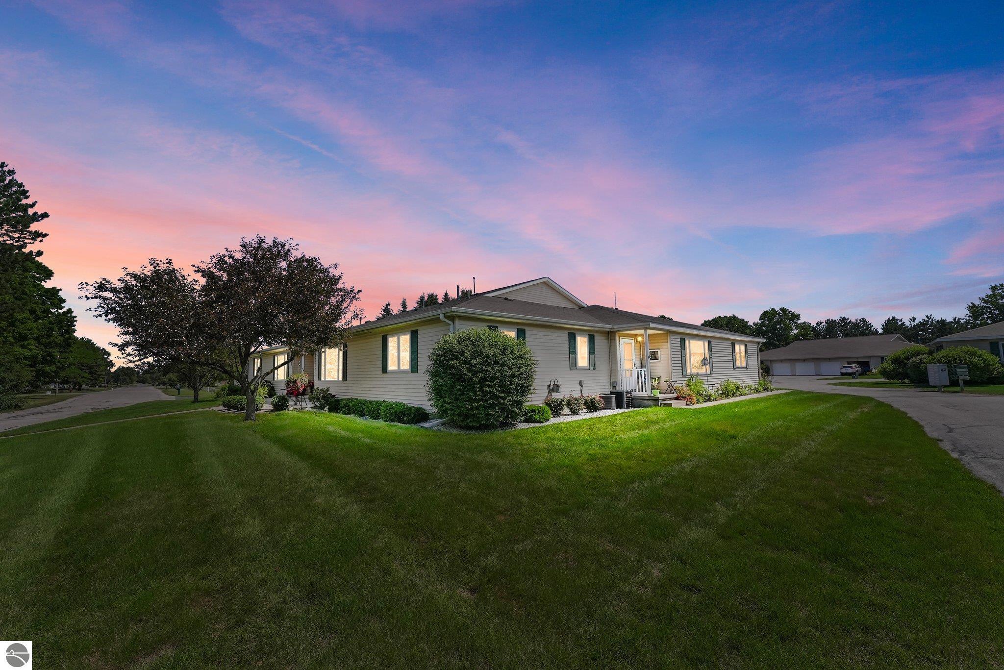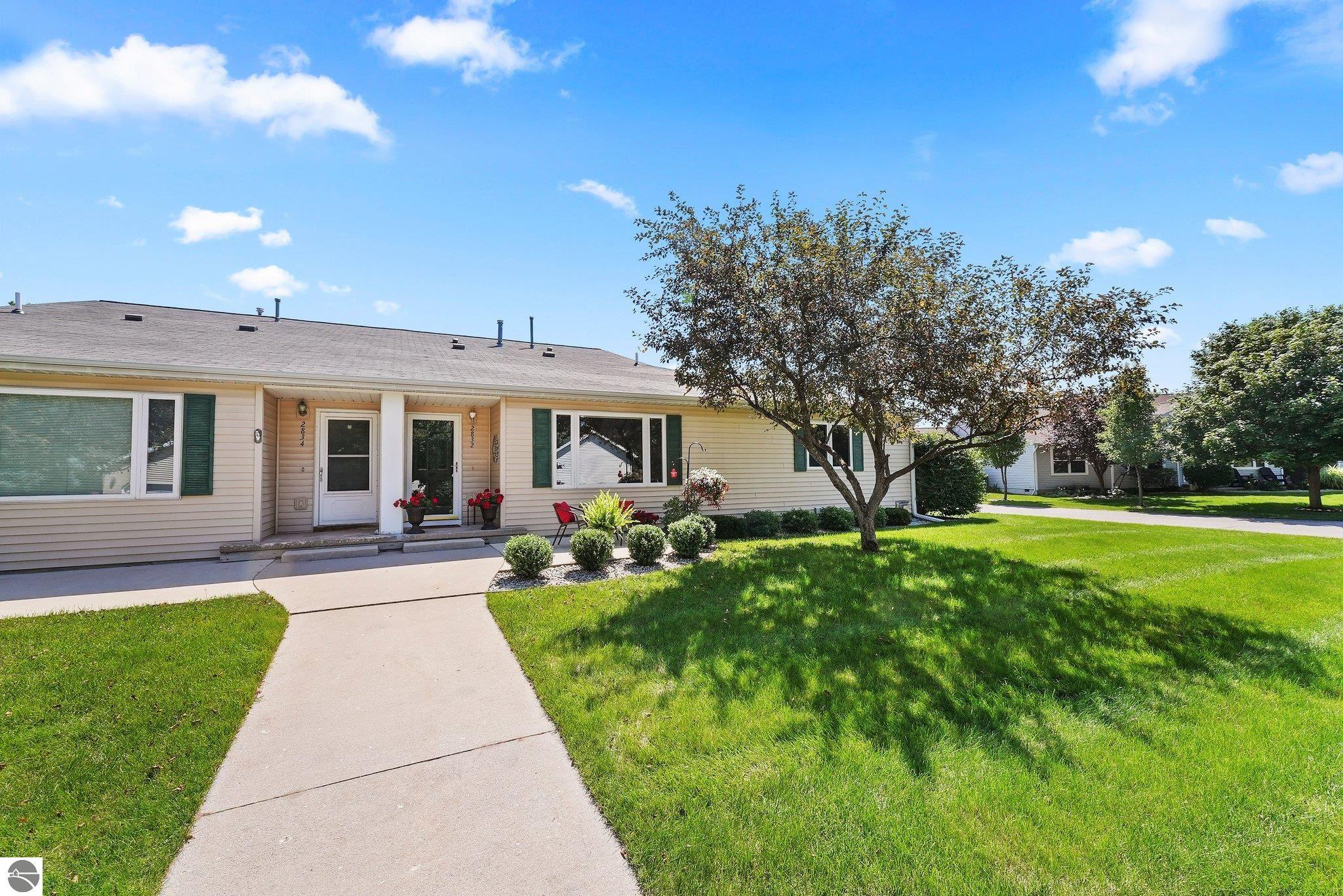 Move in ready! Take advantage of carefree main floor living, & great location to everything situated in Emerald Bluffs condo development. Enjoy just the right amount of space with an open & bright floor plan, lovely primary bedroom with private bath. Cathedral ceilings, cozy living room, wonderful kitchen design with new GE Stainless Appliances in 2025. open dining area and laundry rm. located off garage entrance. Full finished lower level with natural gas fireplace. Central air, attached 1+ car garage & landscaped yard with irrigation & covered front entrance. There is a private gate for owners to nearby shopping & restaurants, plus a great location in T.C.!