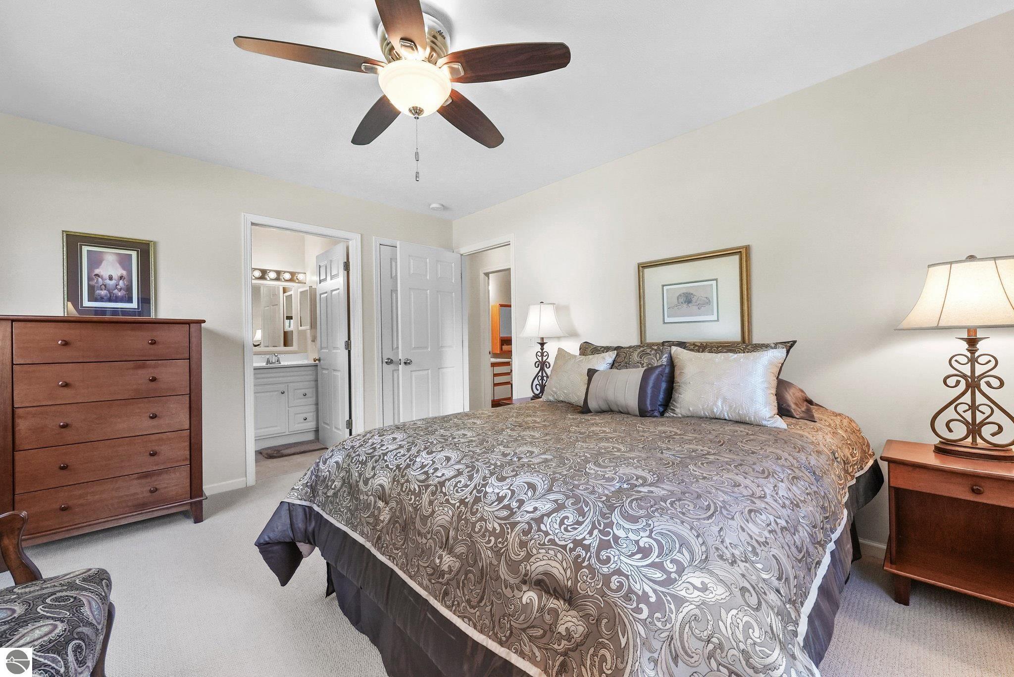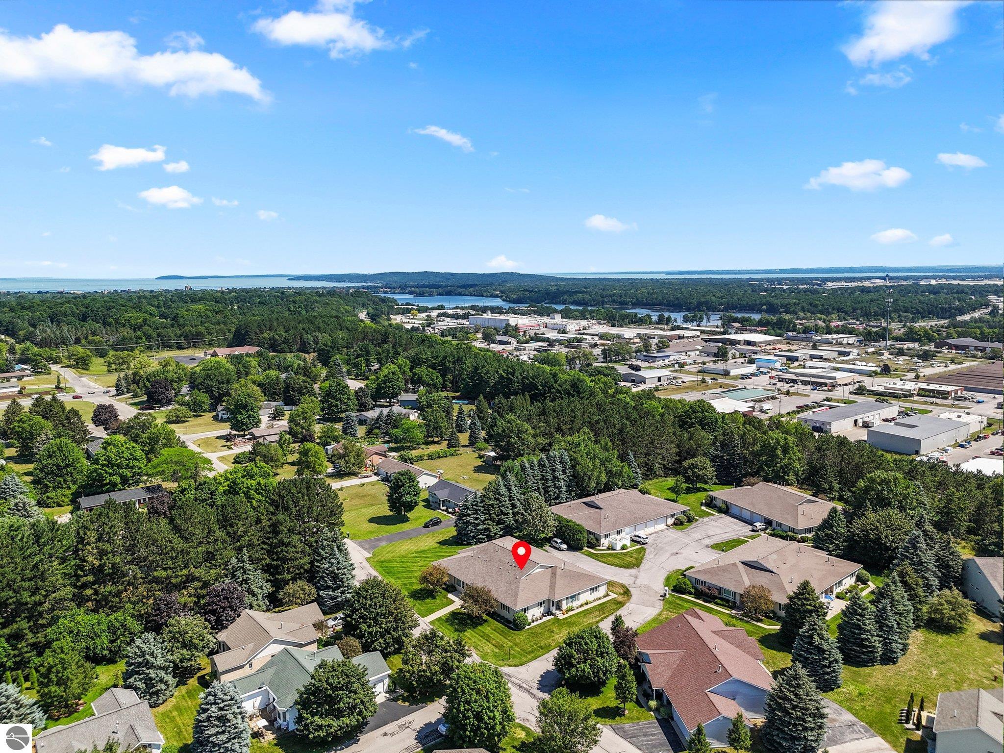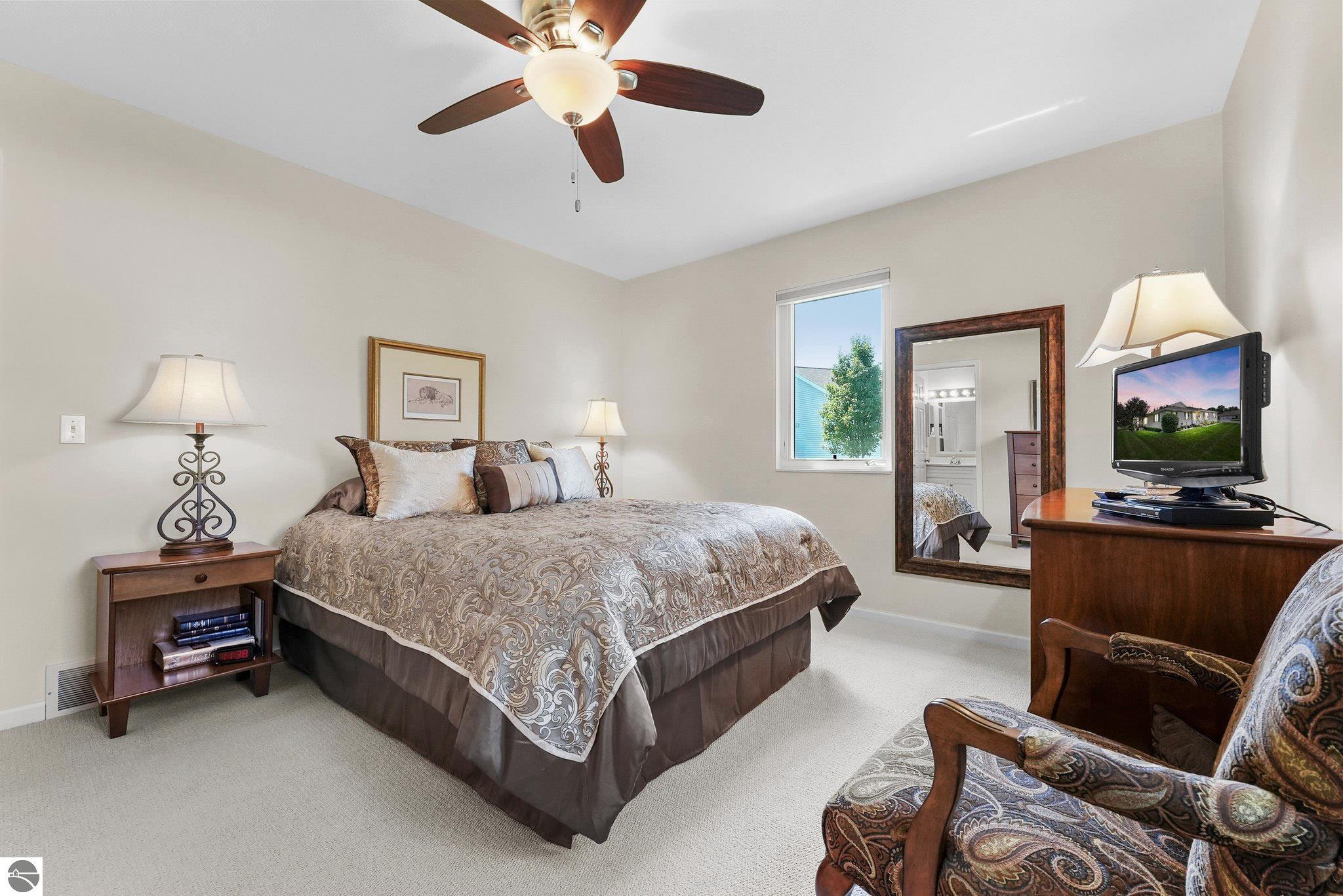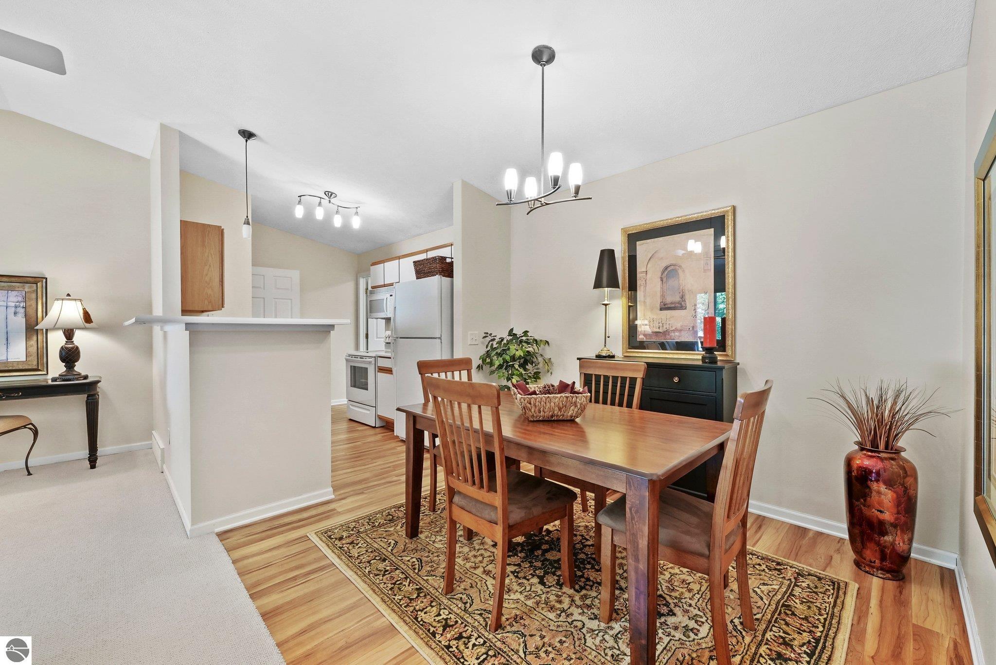 Move in ready! Take advantage of carefree main floor living, & great location to everything situated in Emerald Bluffs condo development. Enjoy just the right amount of space with an open & bright floor plan, lovely primary bedroom with private bath. Cathedral ceilings, cozy living room, wonderful kitchen design with new GE Stainless Appliances in 2025. open dining area and laundry rm. located off garage entrance. Full finished lower level with natural gas fireplace. Central air, attached 1+ car garage & landscaped yard with irrigation & covered front entrance. There is a private gate for owners to nearby shopping & restaurants, plus a great location in T.C.!