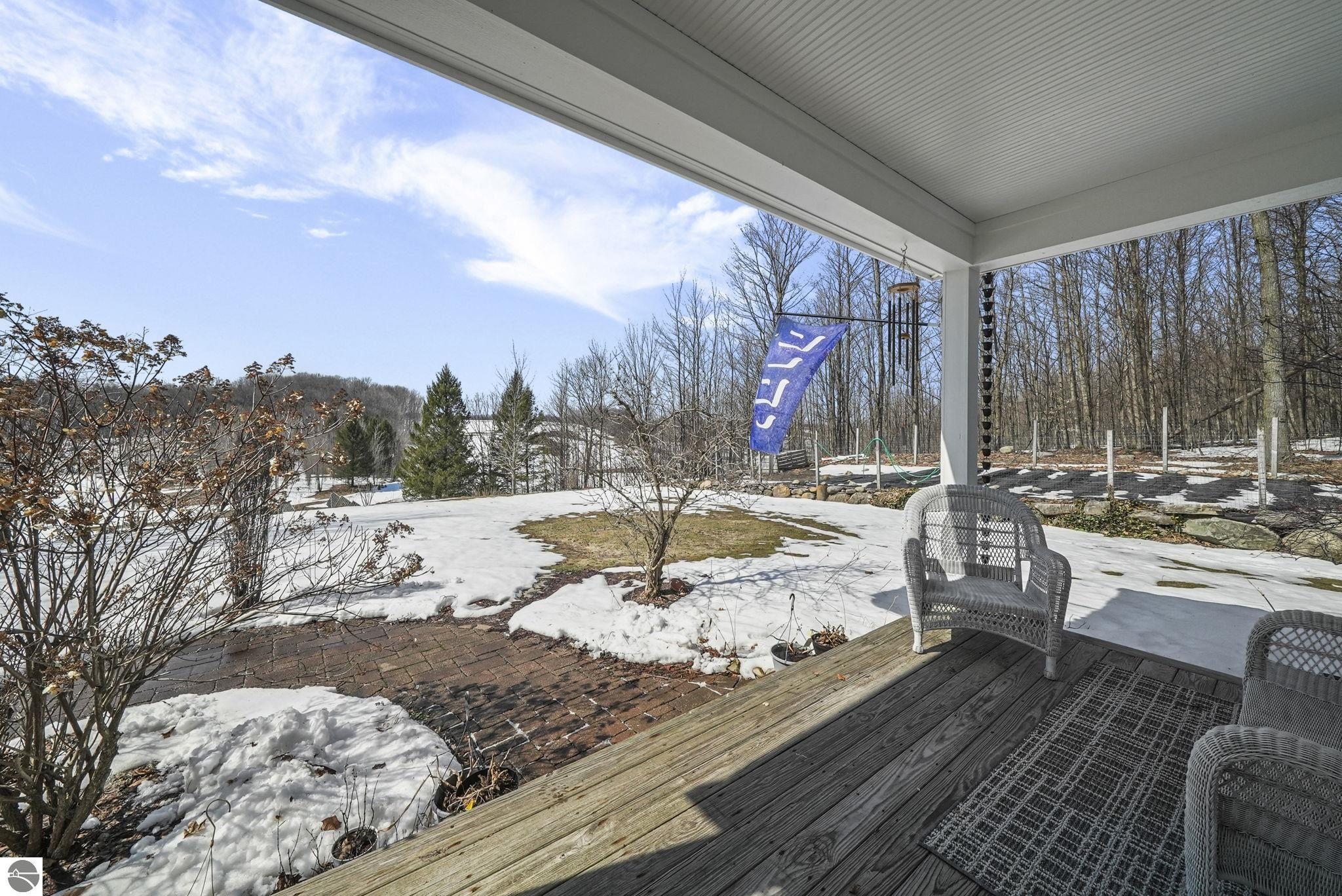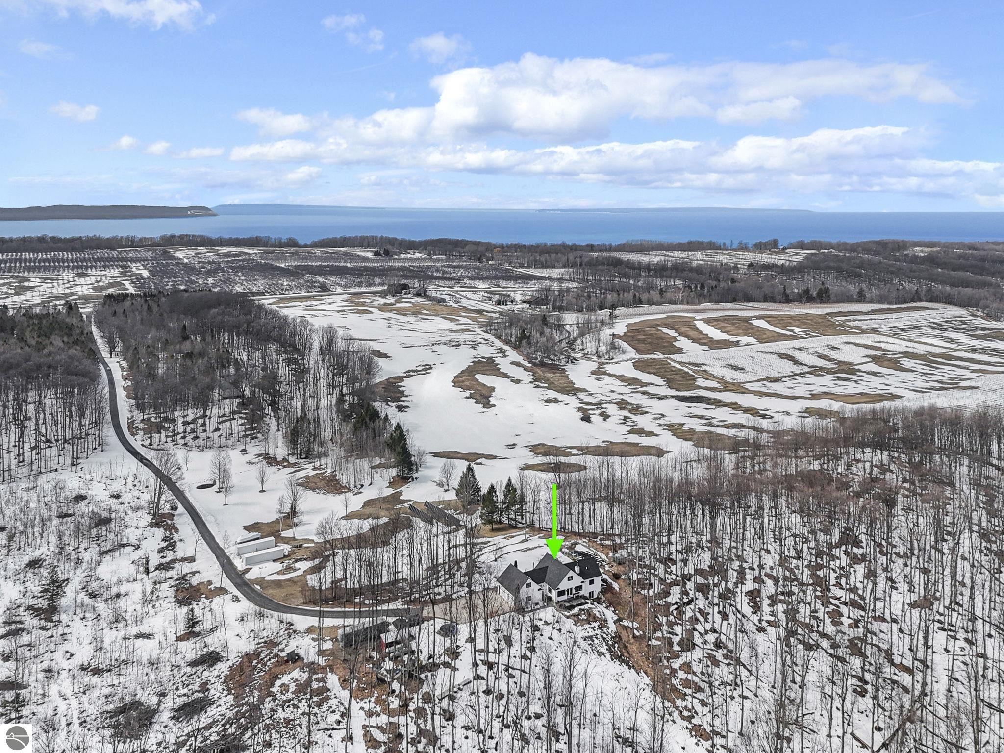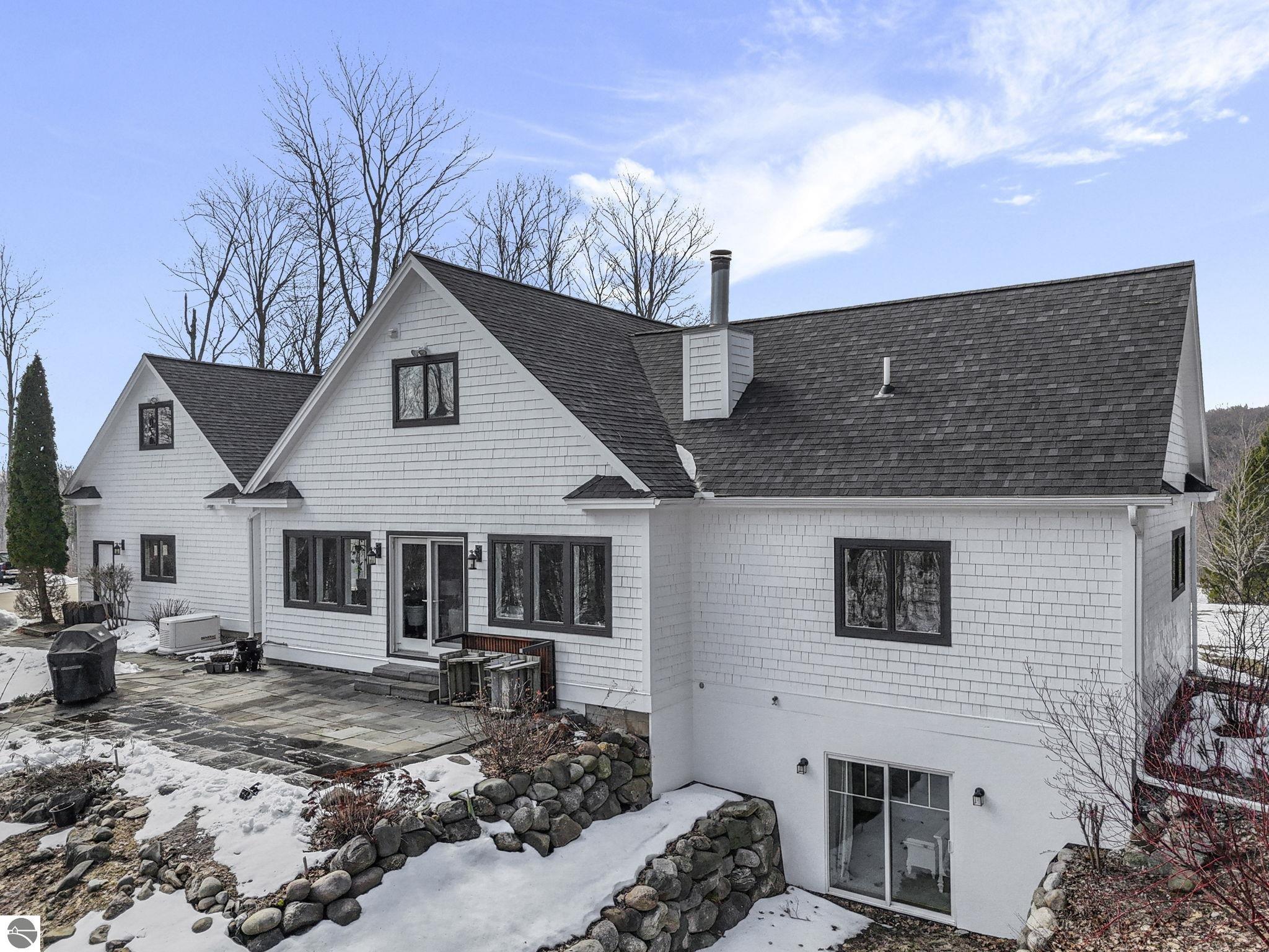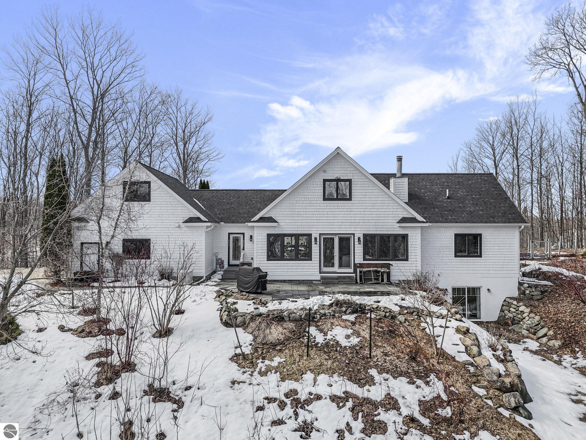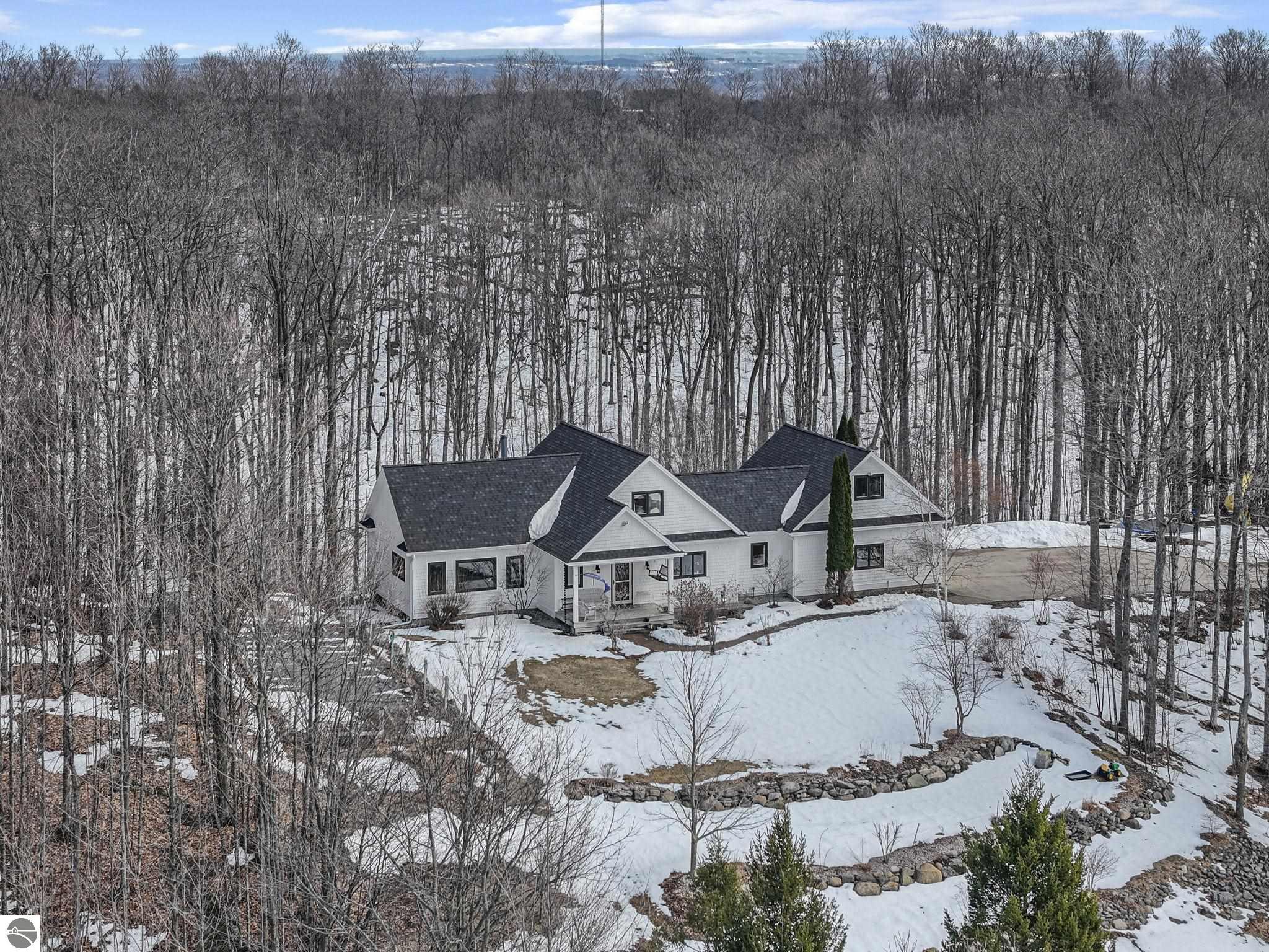 Escape to your own private oasis on 10 rolling acres in highly sought-after Leelanau County, where refined comfort meets natural beauty. This exceptional 1.5-story home offers an abundance of finished sq. ft. with a light filled open design ideal for both everyday living and entertaining. Featuring 4 bedrooms, 3.5 baths, and a versatile bonus room, the home showcases quality throughout. The newly remodeled island kitchen is appointed with stainless steel appliances, granite countertops and abundant cabinetry, while rich hardwood flooring flows through the main level. The inviting living room features a wood-burning fireplace, built-ins & access to rear patio. Main floor primary suite offers a spa like en-suite with soaking tub and tiled walk-in shower. Finished walkout lower level offers family area, rec-area, office area, gas log fireplace, 4th bedroom, full bath and storage rooms. Additional highlights include a finished heated garage, main floor laundry/mudroom, back-up generator and solar panels, fiber optic internet via point broadband service. Thoughtfully designed outdoor spaces with multiple seating areas and extensive landscaping create a serene setting. Enjoy peaceful privacy just a short drive to Lake Michigan, Inland Lakes and nearby villages. Take in all that Pure Leelanau County has to offer!