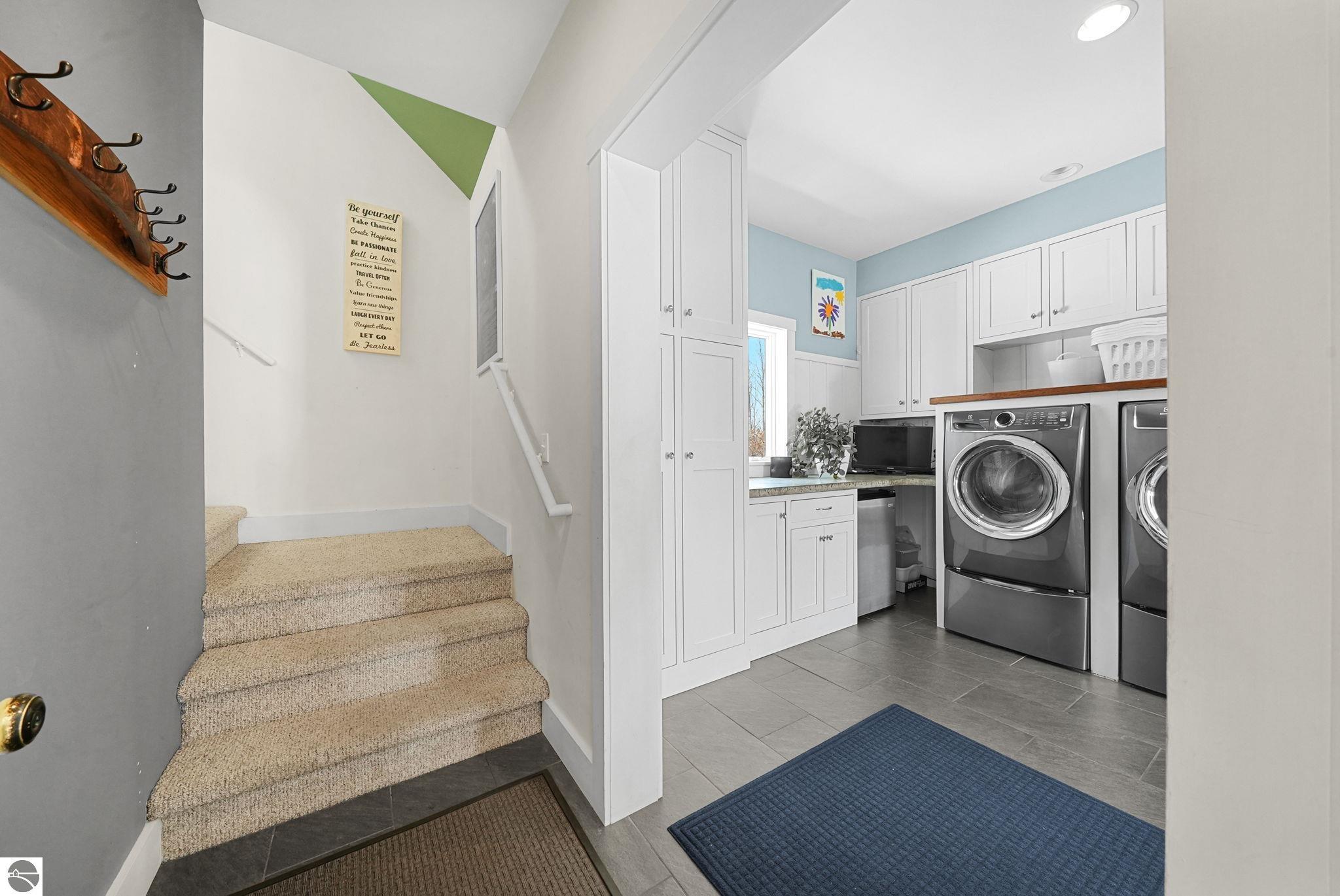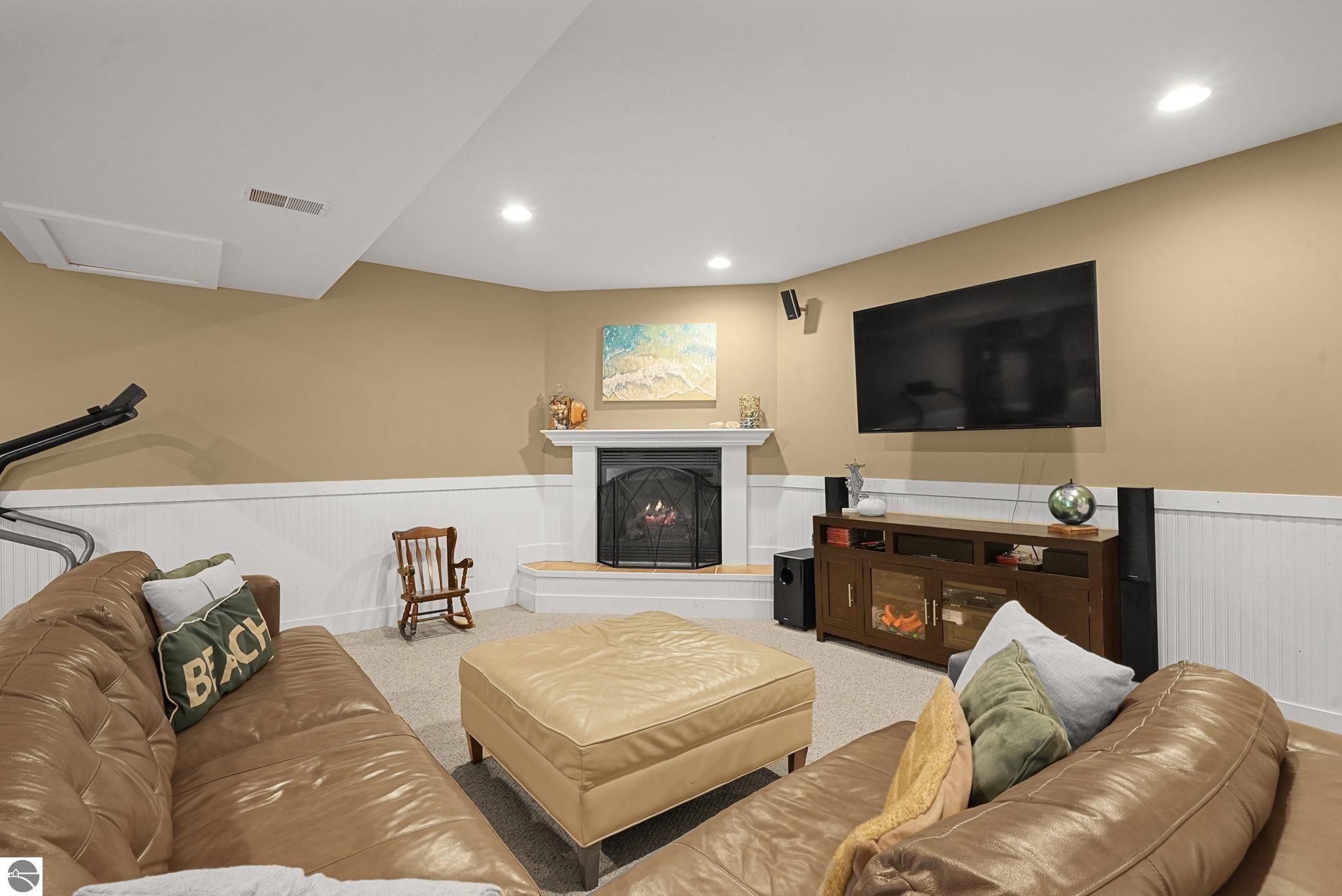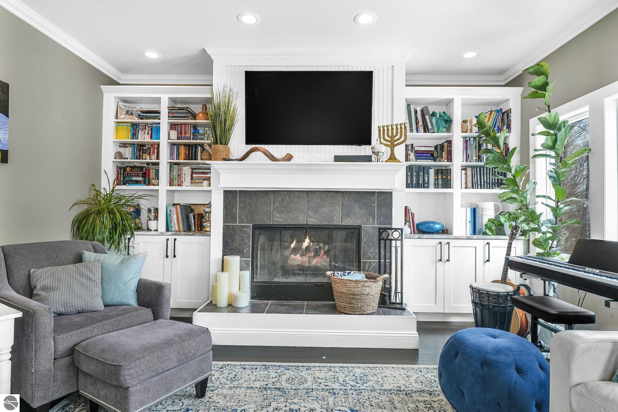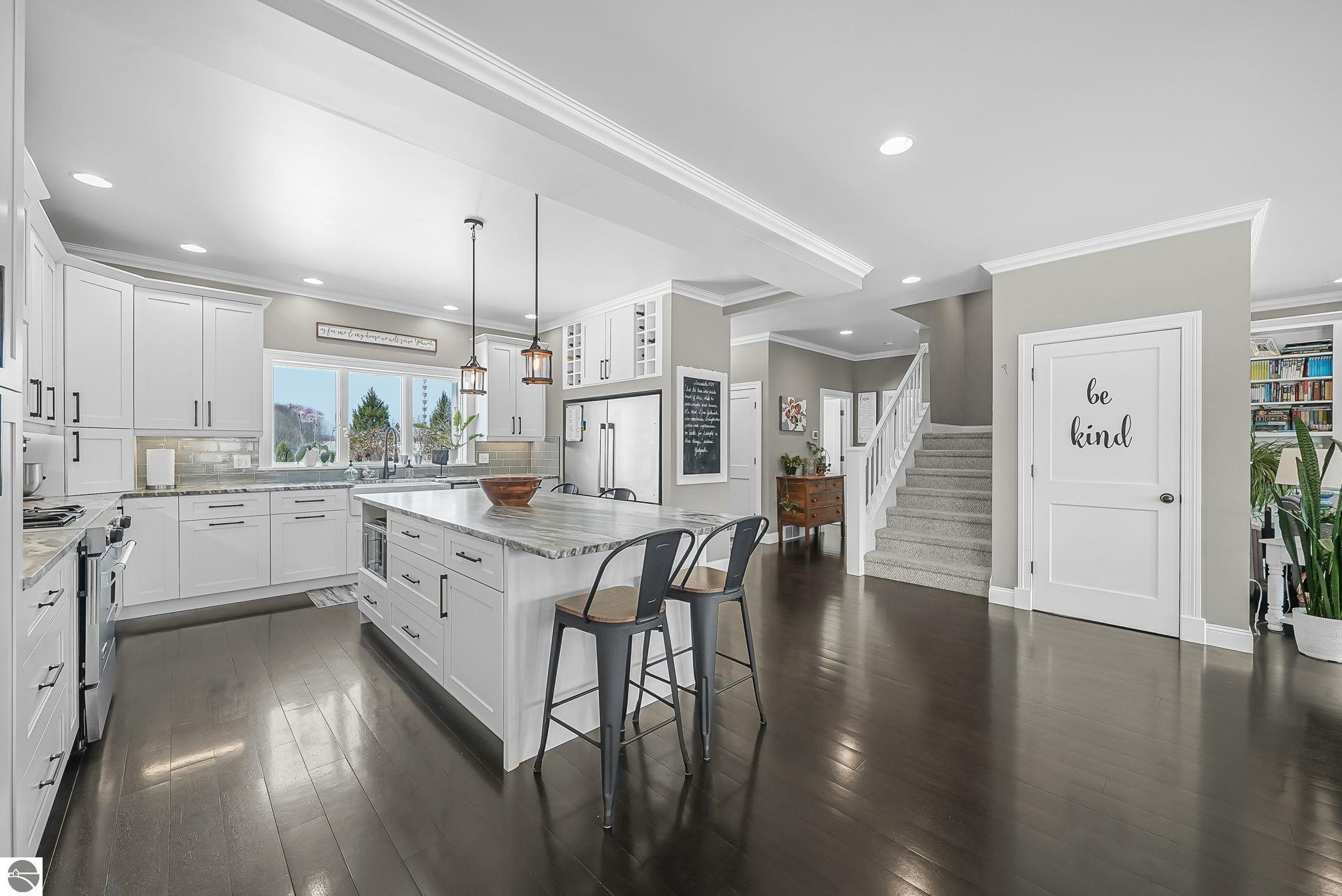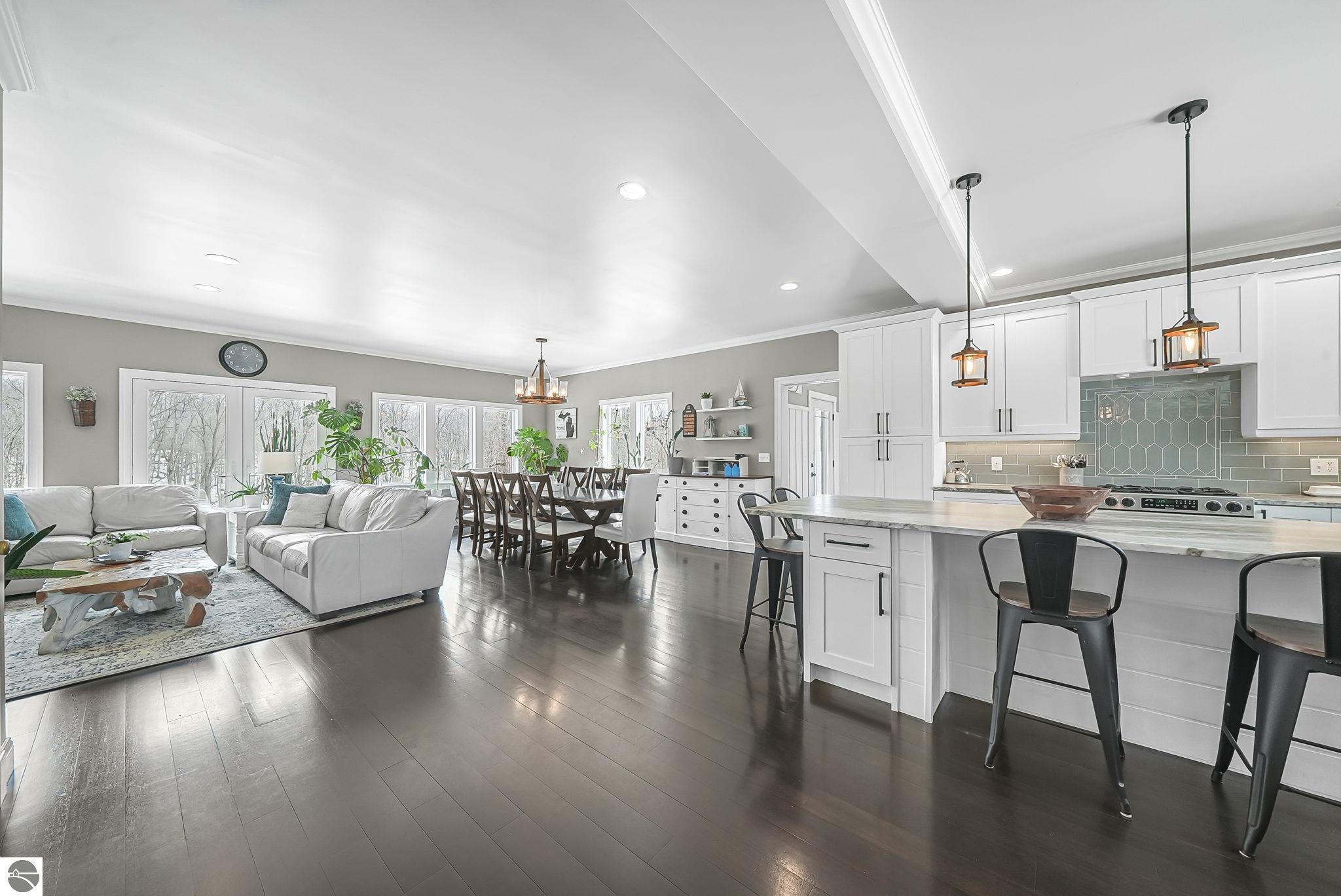 Escape to your own private oasis on 10 rolling acres in highly sought-after Leelanau County, where refined comfort meets natural beauty. This exceptional 1.5-story home offers an abundance of finished sq. ft. with a light filled open design ideal for both everyday living and entertaining. Featuring 4 bedrooms, 3.5 baths, and a versatile bonus room, the home showcases quality throughout. The newly remodeled island kitchen is appointed with stainless steel appliances, granite countertops and abundant cabinetry, while rich hardwood flooring flows through the main level. The inviting living room features a wood-burning fireplace, built-ins & access to rear patio. Main floor primary suite offers a spa like en-suite with soaking tub and tiled walk-in shower. Finished walkout lower level offers family area, rec-area, office area, gas log fireplace, 4th bedroom, full bath and storage rooms. Additional highlights include a finished heated garage, main floor laundry/mudroom, back-up generator and solar panels, fiber optic internet via point broadband service. Thoughtfully designed outdoor spaces with multiple seating areas and extensive landscaping create a serene setting. Enjoy peaceful privacy just a short drive to Lake Michigan, Inland Lakes and nearby villages. Take in all that Pure Leelanau County has to offer!