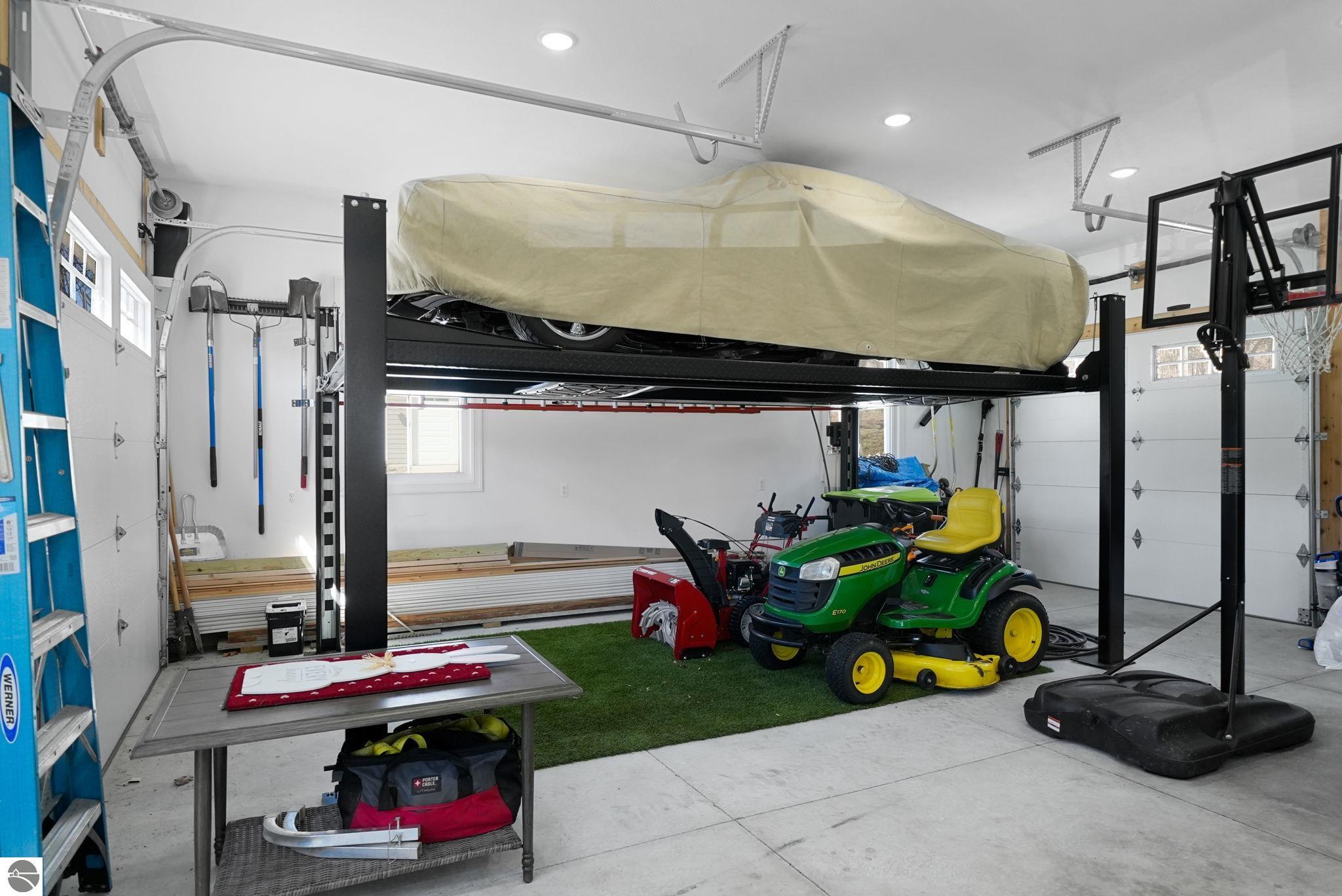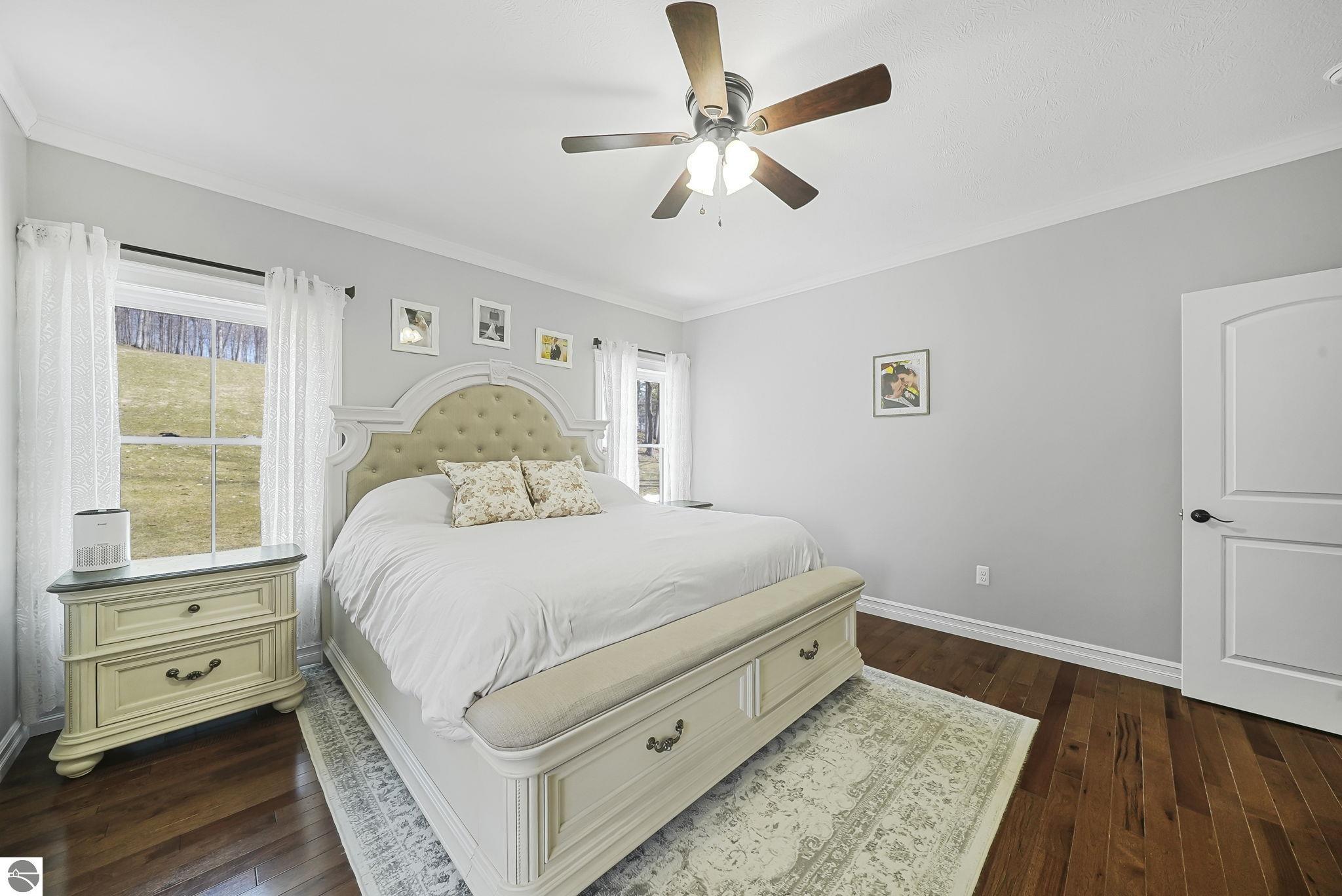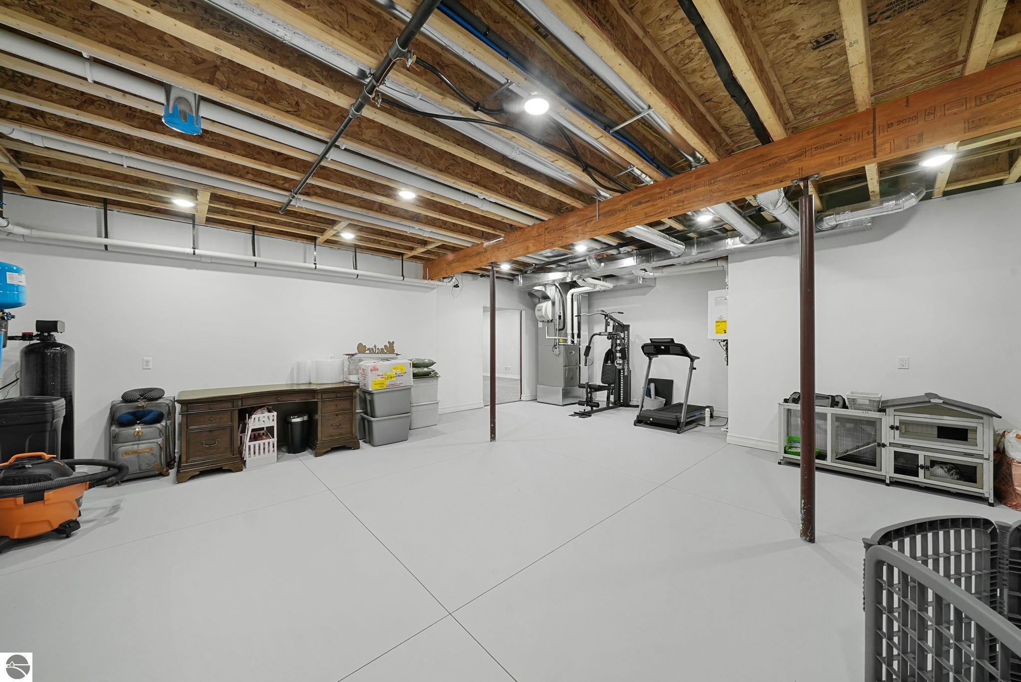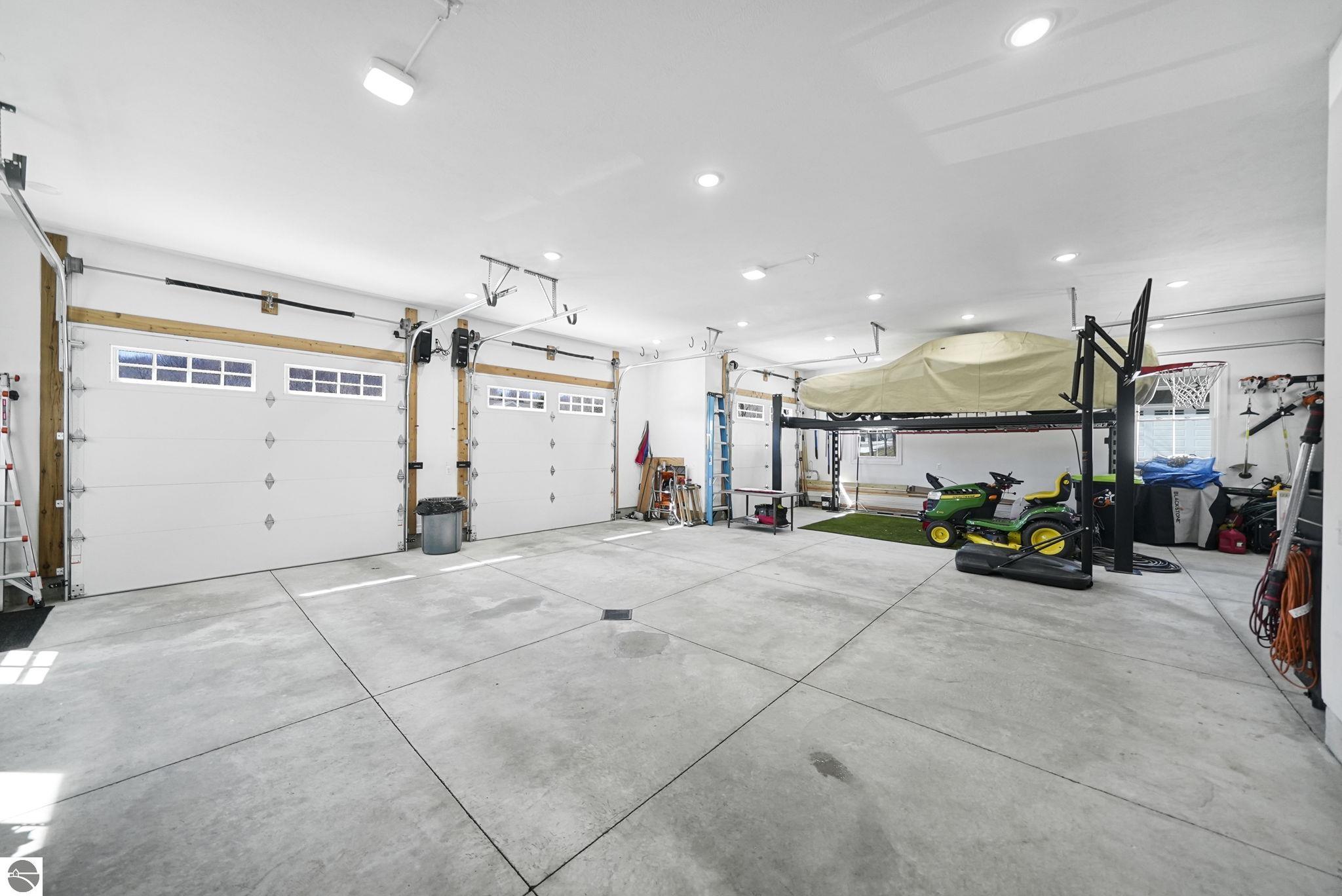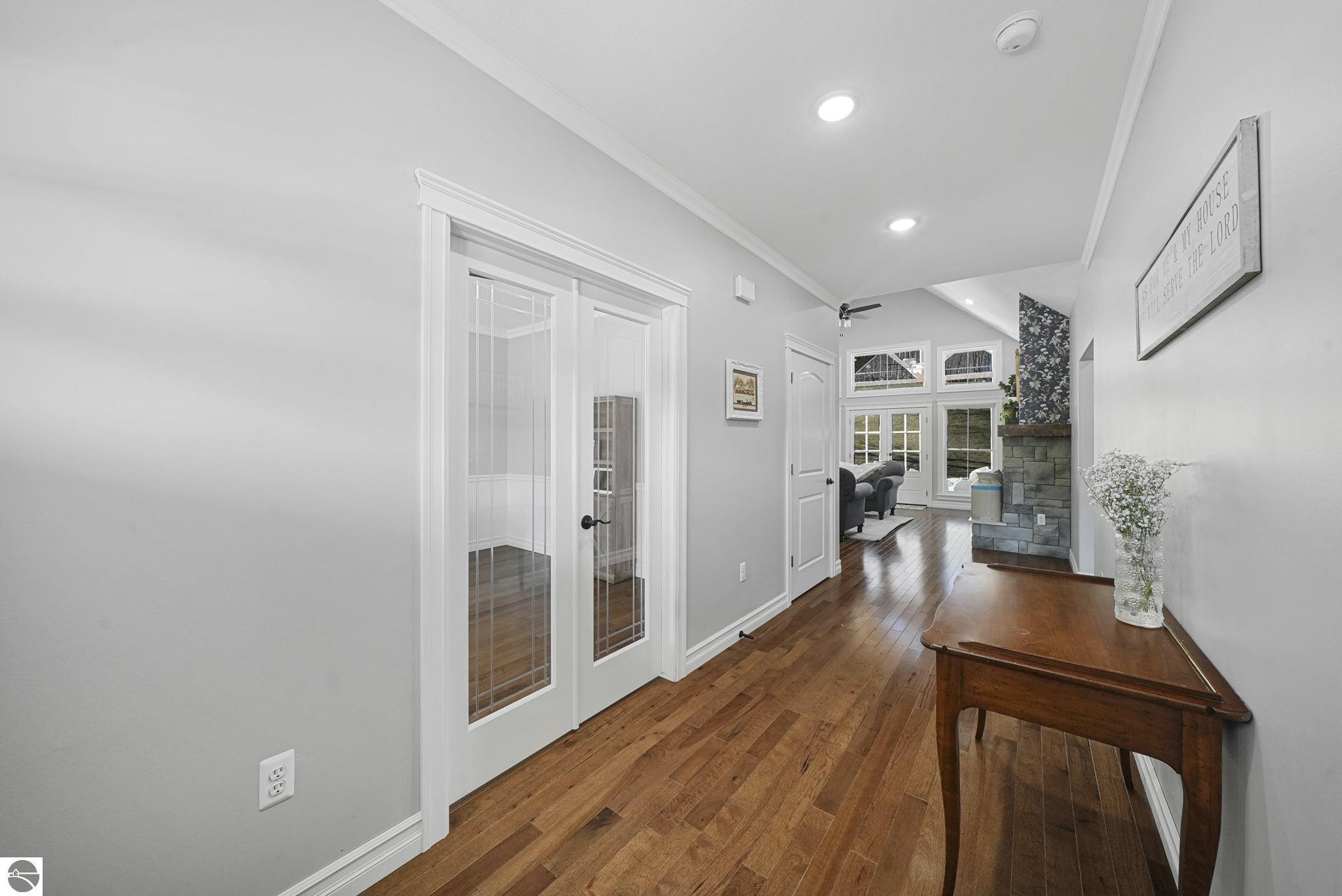 This stunning custom-built home showcases exceptional attention to detail throughout. Nestled in desirable Leelanau Highlands and if you are looking for space, this home delivers. Offering plenty of room to live, relax and entertain. Bright, open living areas feature cathedral ceilings and rich hardwood and tile flooring throughout the main level. The gracious living room with fireplace flows seamlessly to a large covered rear porch perfect for outdoor entertaining. The island kitchen is thoughtfully designed with butcher block countertops, stainless double wall ovens, gas cook top and a walk-in pantry. Enjoy the ease of main floor living, including a spacious primary suite with a well-appointed en-suite featuring a soaking tub, tiled walk-in shower, and walk-in closet. Two additional bedrooms are thoughtfully situated with a Jack and Jill bath. The finished lower level expands your living space with a large family room, wet bar, fourth bedroom, and full bath. A mudroom and half bath are conveniently located off the finished three-car garage, which includes a drive-thru stall. Experience the beauty and serenity of Leelanau County living, just a short drive from Traverse City.
