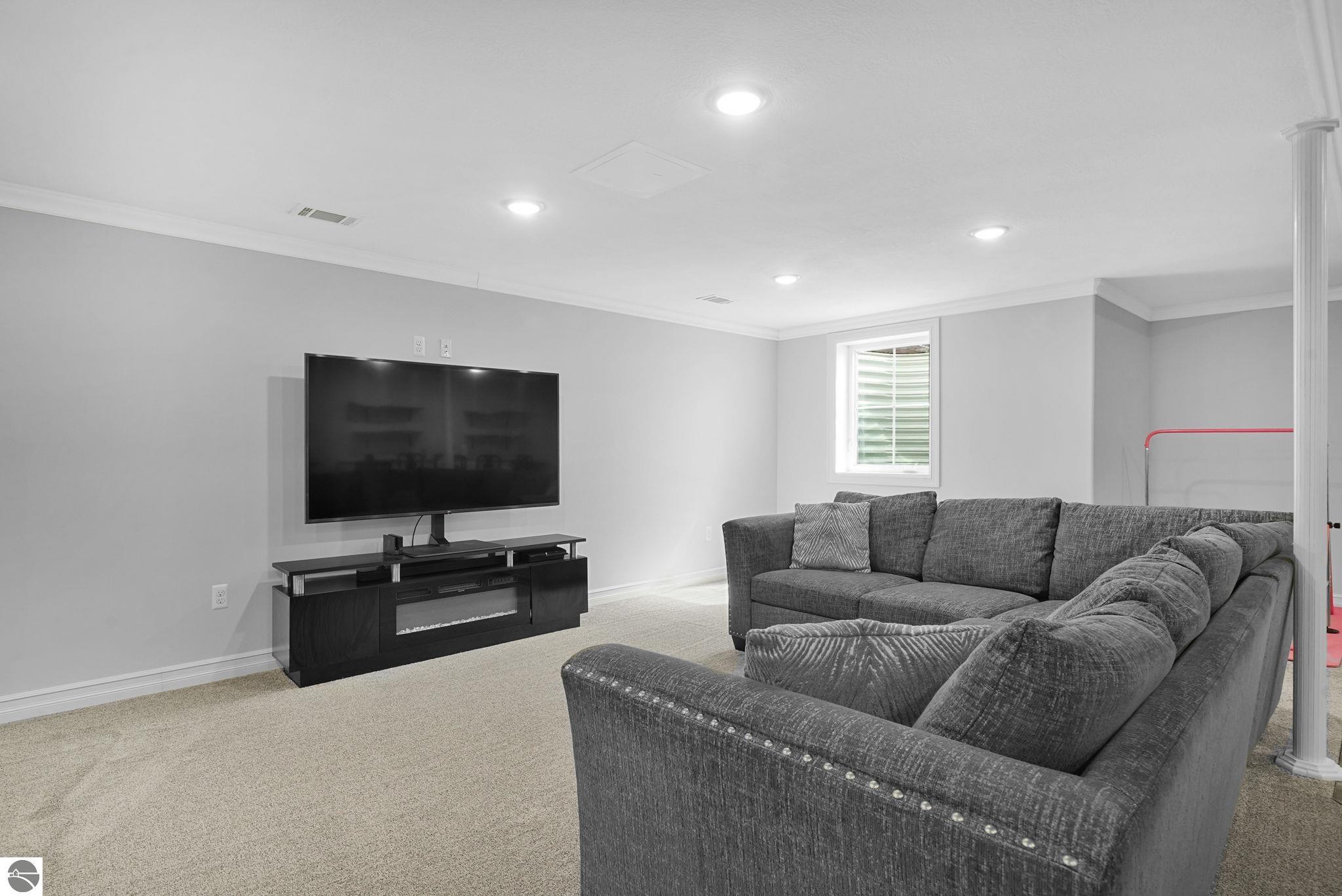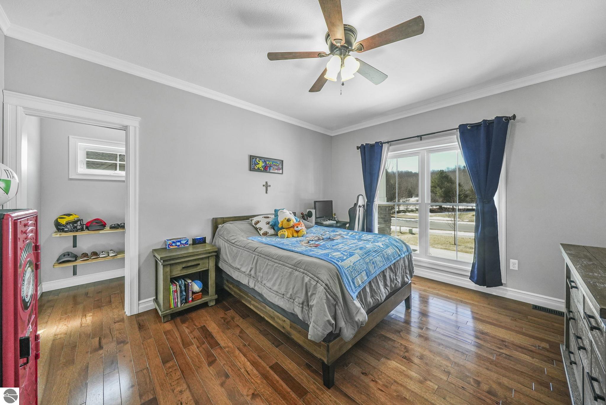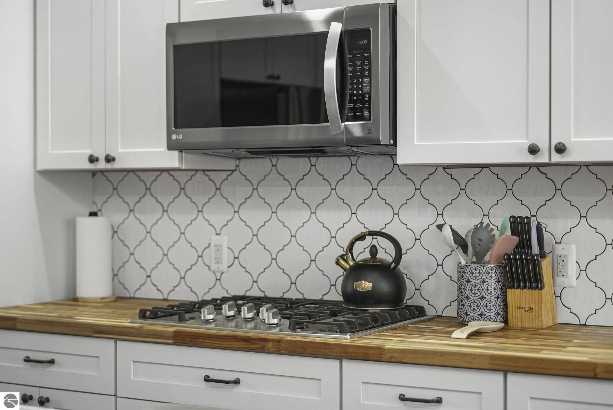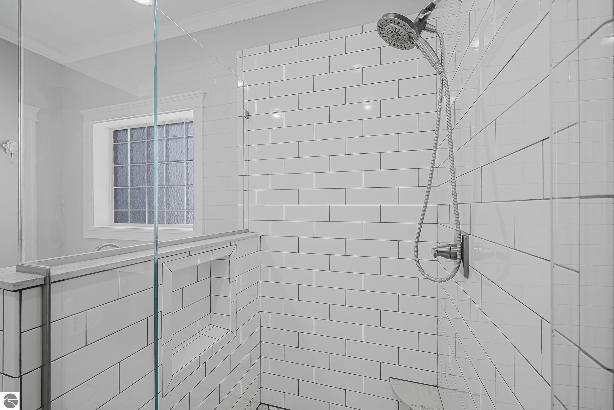 This stunning custom-built home showcases exceptional attention to detail throughout. Nestled in desirable Leelanau Highlands and if you are looking for space, this home delivers. Offering plenty of room to live, relax and entertain. Bright, open living areas feature cathedral ceilings and rich hardwood and tile flooring throughout the main level. The gracious living room with fireplace flows seamlessly to a large covered rear porch perfect for outdoor entertaining. The island kitchen is thoughtfully designed with butcher block countertops, stainless double wall ovens, gas cook top and a walk-in pantry. Enjoy the ease of main floor living, including a spacious primary suite with a well-appointed en-suite featuring a soaking tub, tiled walk-in shower, and walk-in closet. Two additional bedrooms are thoughtfully situated with a Jack and Jill bath. The finished lower level expands your living space with a large family room, wet bar, fourth bedroom, and full bath. A mudroom and half bath are conveniently located off the finished three-car garage, which includes a drive-thru stall. Experience the beauty and serenity of Leelanau County living, just a short drive from Traverse City.