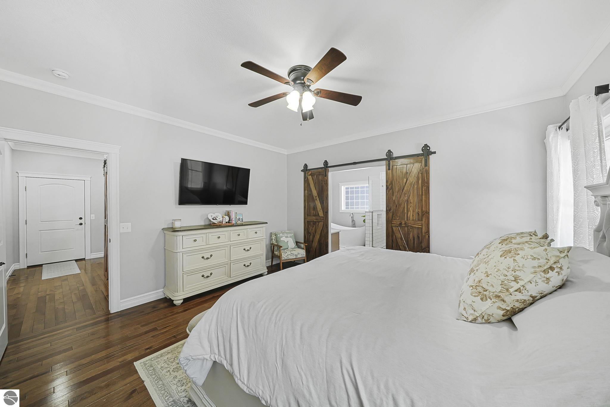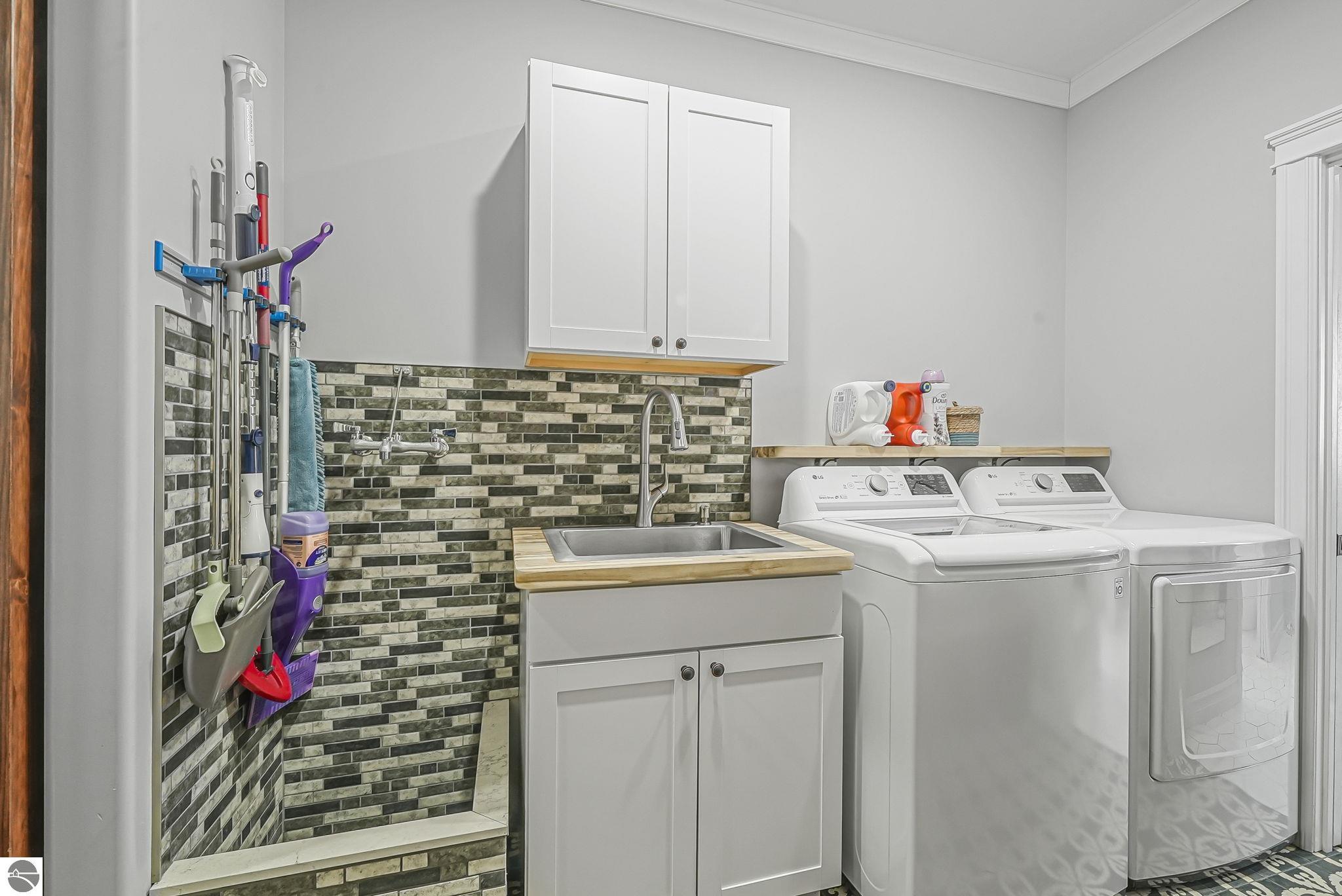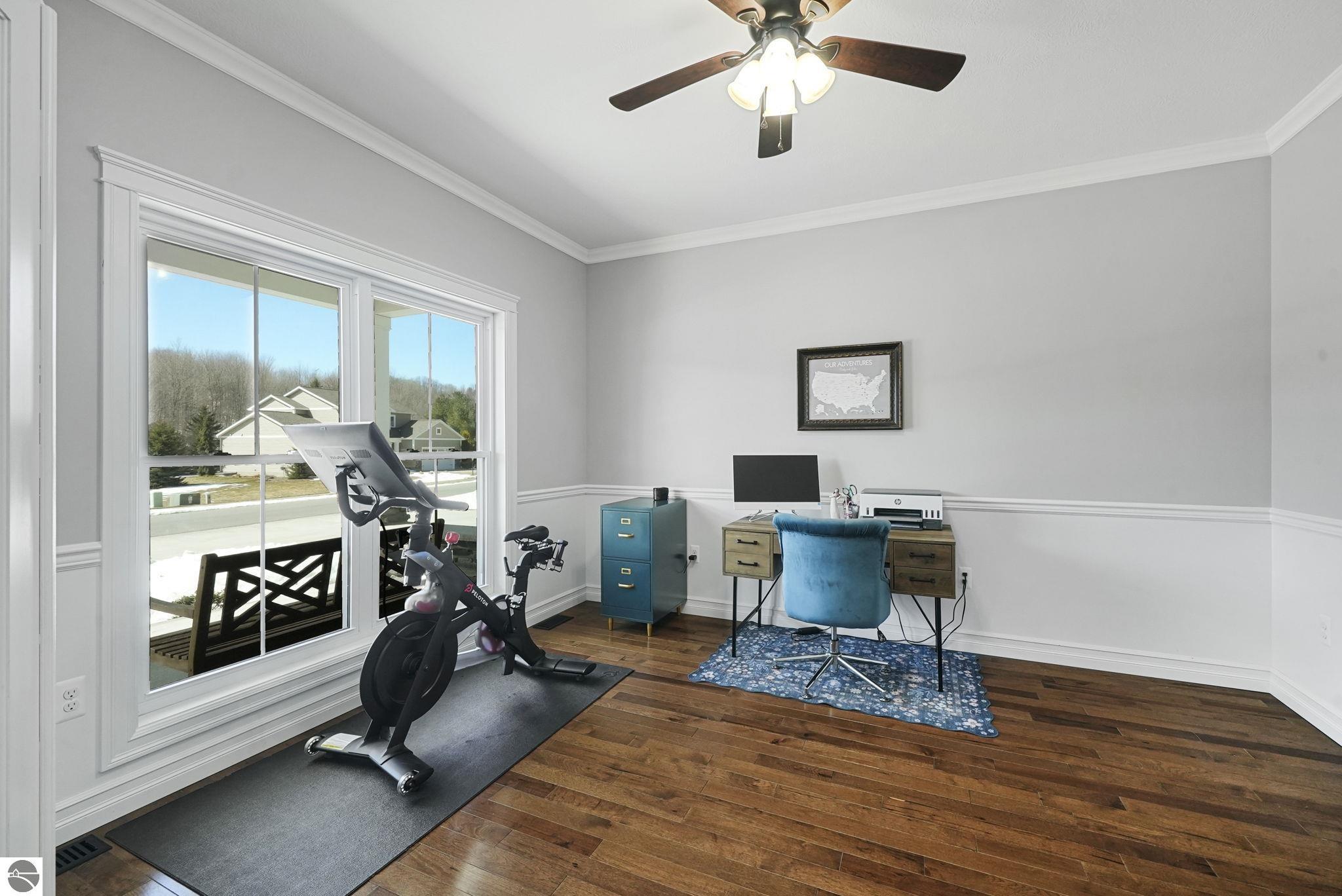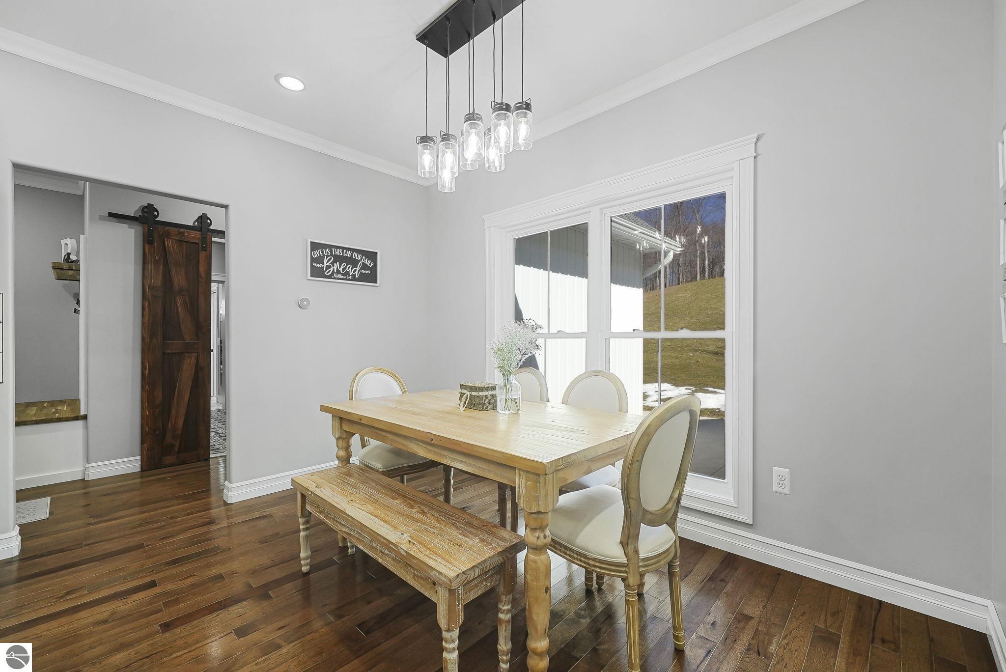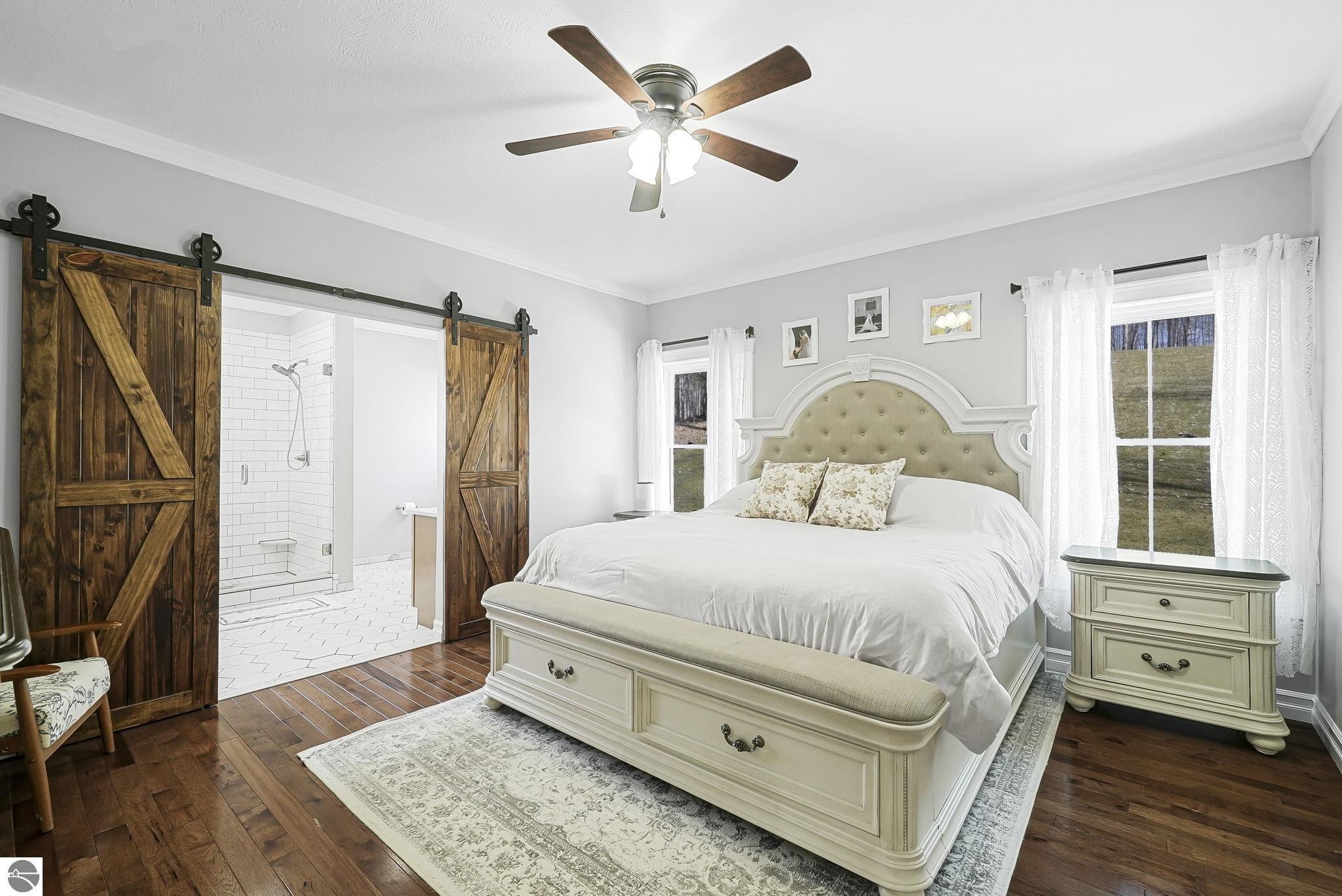 This stunning custom-built home showcases exceptional attention to detail throughout. Nestled in desirable Leelanau Highlands and if you are looking for space, this home delivers. Offering plenty of room to live, relax and entertain. Bright, open living areas feature cathedral ceilings and rich hardwood and tile flooring throughout the main level. The gracious living room with fireplace flows seamlessly to a large covered rear porch perfect for outdoor entertaining. The island kitchen is thoughtfully designed with butcher block countertops, stainless double wall ovens, gas cook top and a walk-in pantry. Enjoy the ease of main floor living, including a spacious primary suite with a well-appointed en-suite featuring a soaking tub, tiled walk-in shower, and walk-in closet. Two additional bedrooms are thoughtfully situated with a Jack and Jill bath. The finished lower level expands your living space with a large family room, wet bar, fourth bedroom, and full bath. A mudroom and half bath are conveniently located off the finished three-car garage, which includes a drive-thru stall. Experience the beauty and serenity of Leelanau County living, just a short drive from Traverse City.