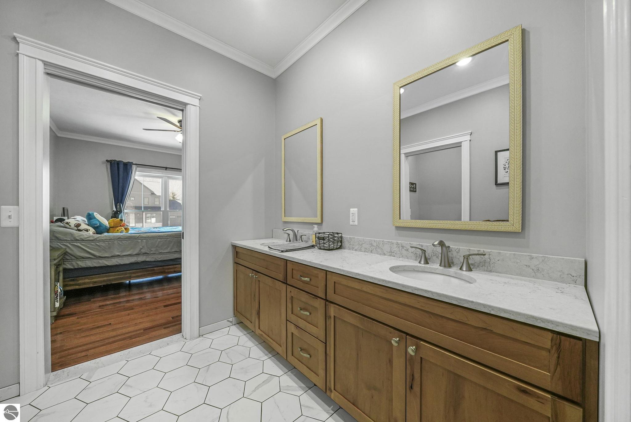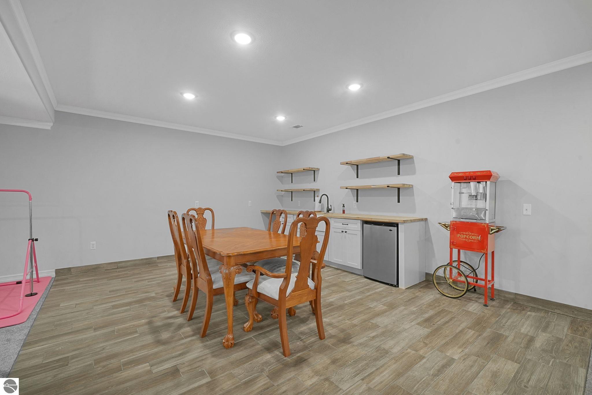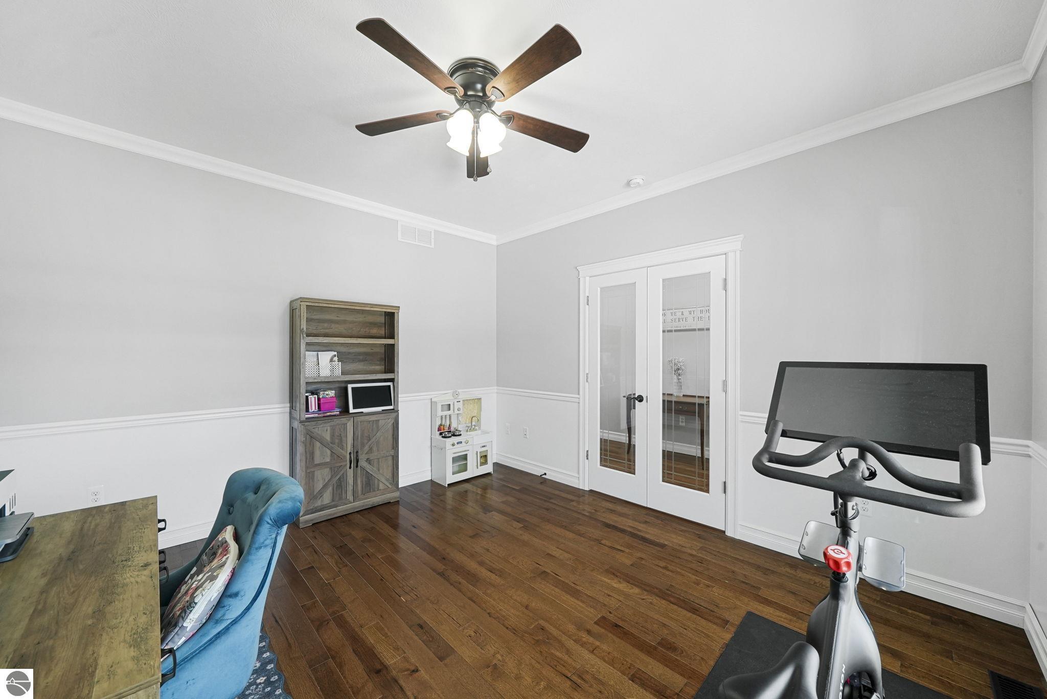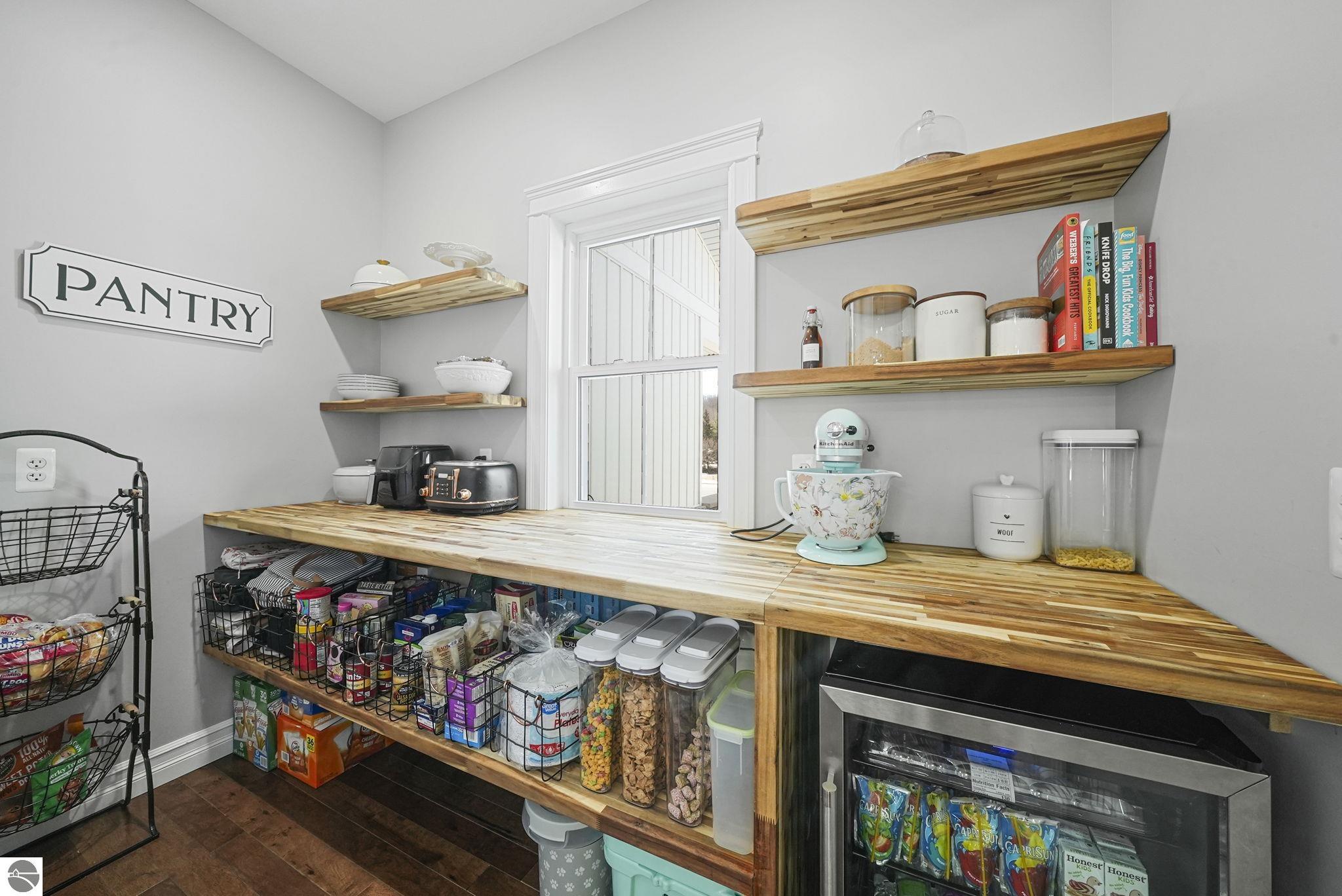 This stunning custom-built home showcases exceptional attention to detail throughout. Nestled in desirable Leelanau Highlands and if you are looking for space, this home delivers. Offering plenty of room to live, relax and entertain. Bright, open living areas feature cathedral ceilings and rich hardwood and tile flooring throughout the main level. The gracious living room with fireplace flows seamlessly to a large covered rear porch perfect for outdoor entertaining. The island kitchen is thoughtfully designed with butcher block countertops, stainless double wall ovens, gas cook top and a walk-in pantry. Enjoy the ease of main floor living, including a spacious primary suite with a well-appointed en-suite featuring a soaking tub, tiled walk-in shower, and walk-in closet. Two additional bedrooms are thoughtfully situated with a Jack and Jill bath. The finished lower level expands your living space with a large family room, wet bar, fourth bedroom, and full bath. A mudroom and half bath are conveniently located off the finished three-car garage, which includes a drive-thru stall. Experience the beauty and serenity of Leelanau County living, just a short drive from Traverse City.